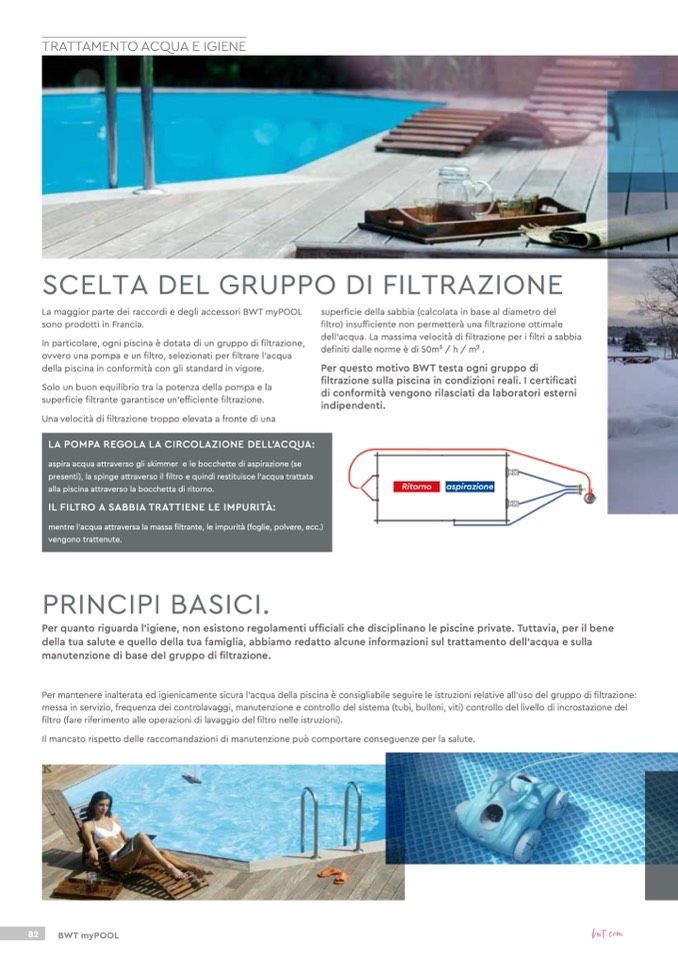 Per mantenere inalterata ed igienicamente sicura l'acqua della piscina è consigliabile seguire le istruzioni relative all'uso del gruppo di filtrazione: