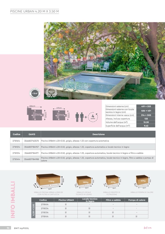 Piscina URBAN 4.20x3.50, grigio, altezza: 1.33, copertura automatica e locale tecnico in legno