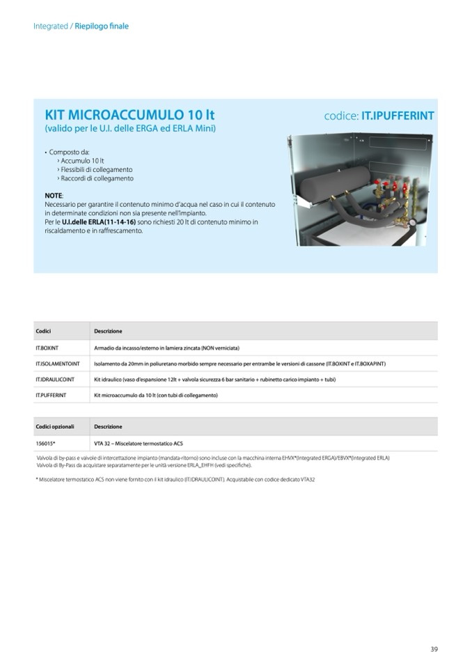 * Miscelatore termostatico ACS non viene fornito con il kit idraulico (IT.IDRAULICOINT). Acquistabile con codice dedicato VTA32