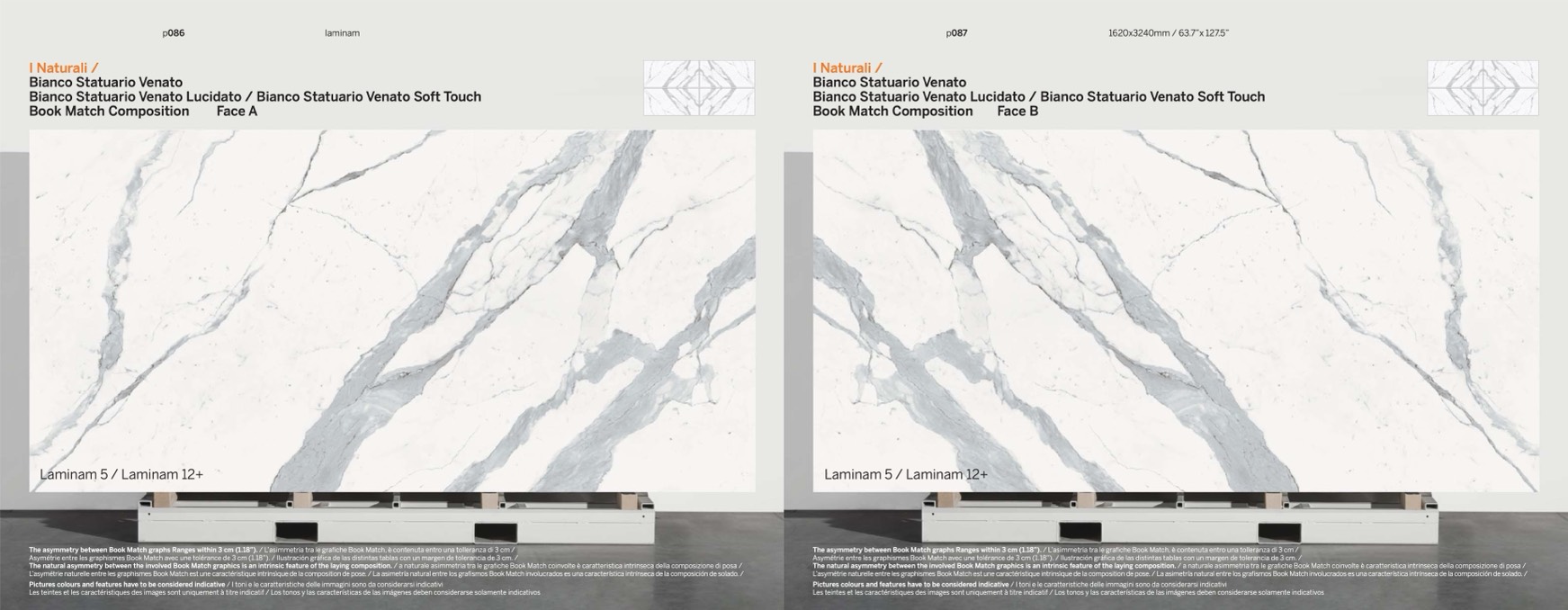 The natural asymmetry between the involved Book Match graphics is an intrinsic feature of the laying composition. / a naturale asimmetria tra le grafiche Book Match coinvolte è caratteristica intrinseca della composizione di posa /