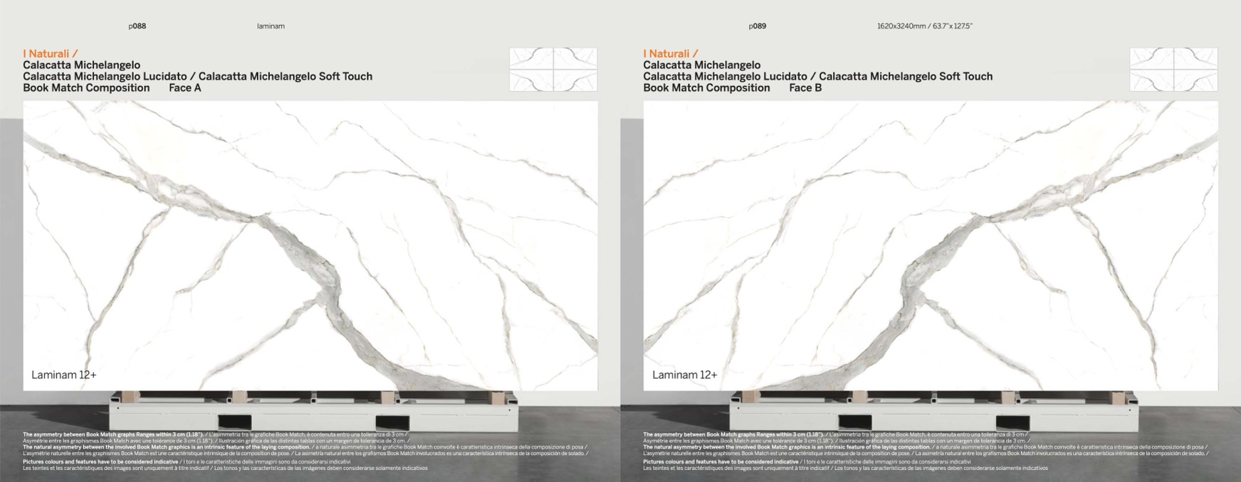 The natural asymmetry between the involved Book Match graphics is an intrinsic feature of the laying composition. / a naturale asimmetria tra le grafiche Book Match coinvolte è caratteristica intrinseca della composizione di posa /