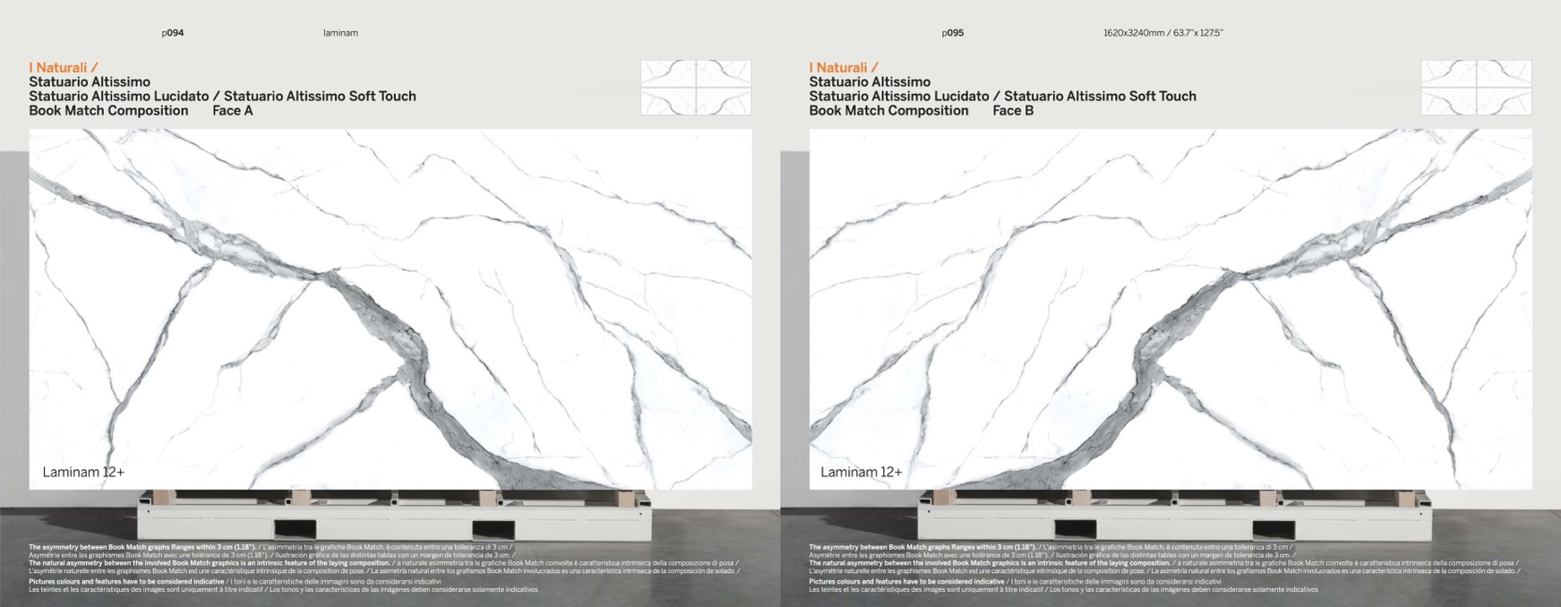 The natural asymmetry between the involved Book Match graphics is an intrinsic feature of the laying composition. / a naturale asimmetria tra le grafiche Book Match coinvolte è caratteristica intrinseca della composizione di posa /