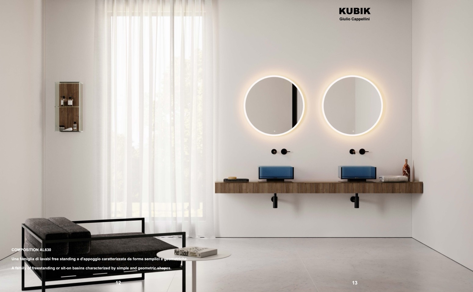 Una famiglia di lavabi free standing o d'appoggio caratterizzata da forme semplici e geometriche.
