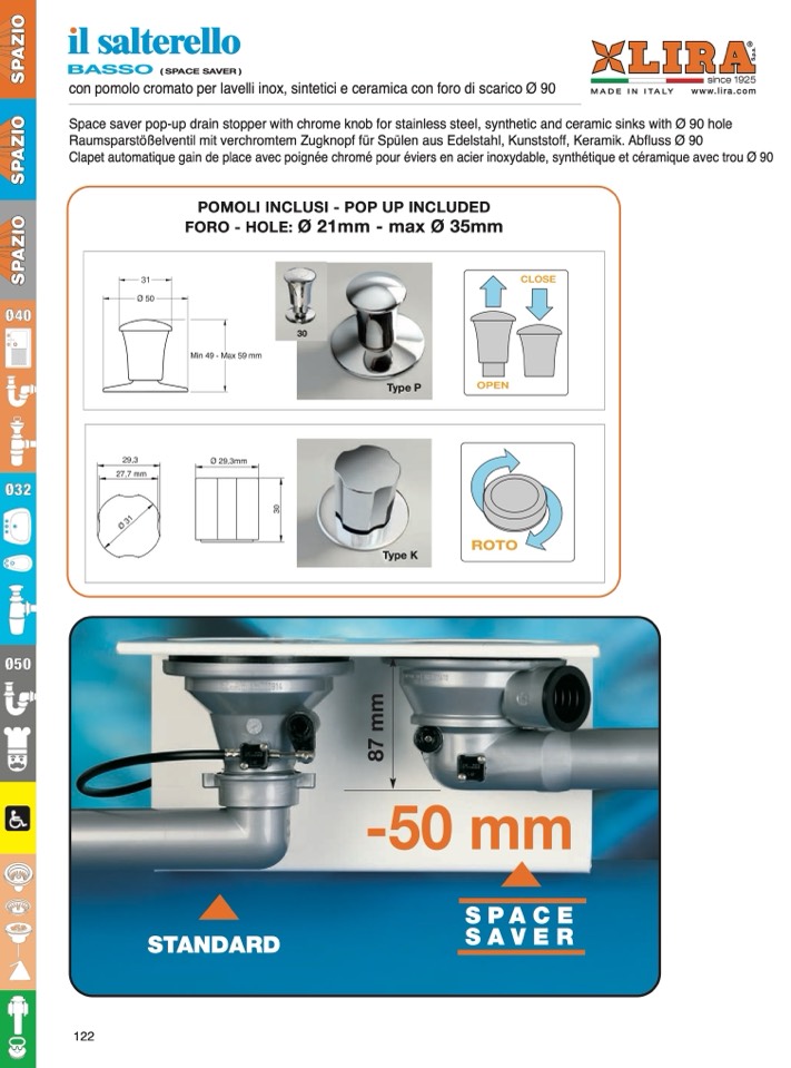 Space saver pop-up drain stopper with chrome knob for stainless steel, synthetic and ceramic sinks with Ø 90 hole