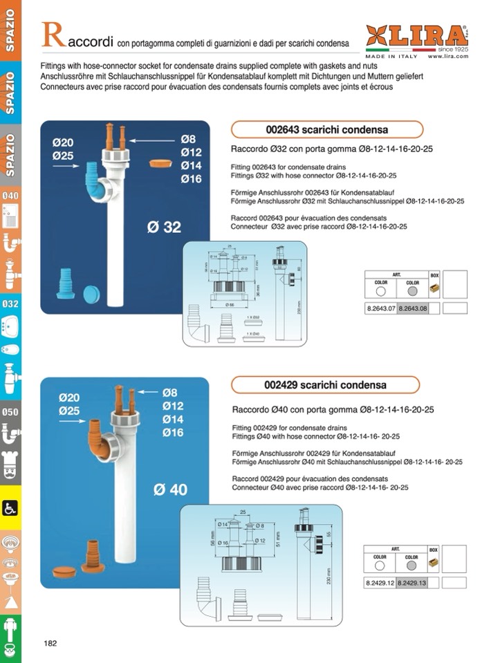 Fittings with hose-connector socket for condensate drains supplied complete with gaskets and nuts