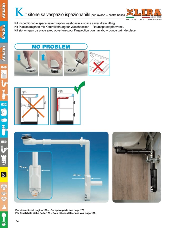 Kit inspectionable space saver trap for washbasin + space saver drain fitting.