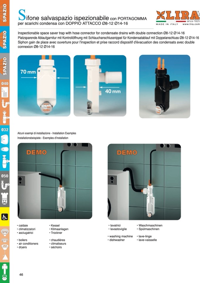 Inspectionable space saver trap with hose connector for condensate drains with double connection Ø8-12 Ø14-16