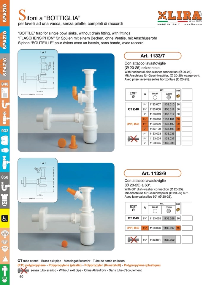 “BOTTLE” trap for single bowl sinks, without drain fitting, with fittings