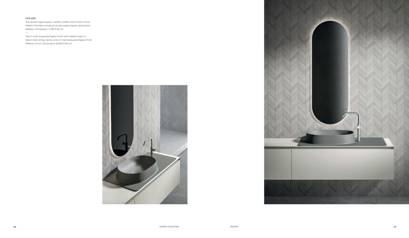 Stone Color Ghisa. Vanity units in matt lacquered Agata finish.