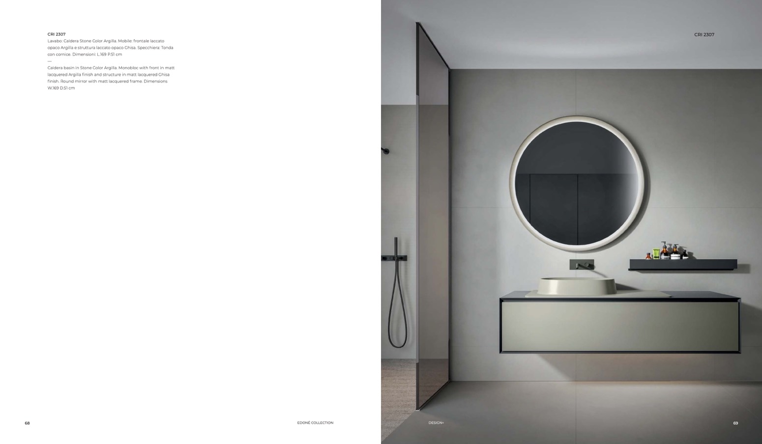 Lavabo: Caldera Stone Color Argilla. Mobile: frontale laccato