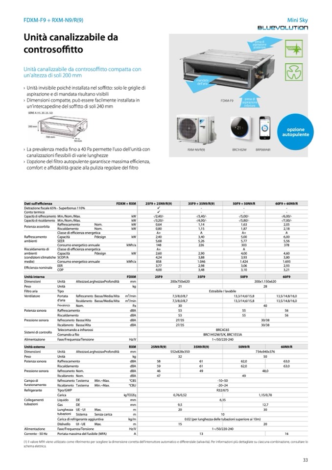 (1) Il valore MFA viene utilizzato come riferimento per scegliere la dimensione corretta dell'interruttore automatico e differenziale (salvavita). Per informazioni più dettagliate su ciascuna combinazione, consultare lo