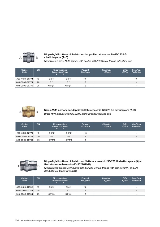 Nickel plated brass M/M nipples with ISO 228 G male thread with plane end (A) and E