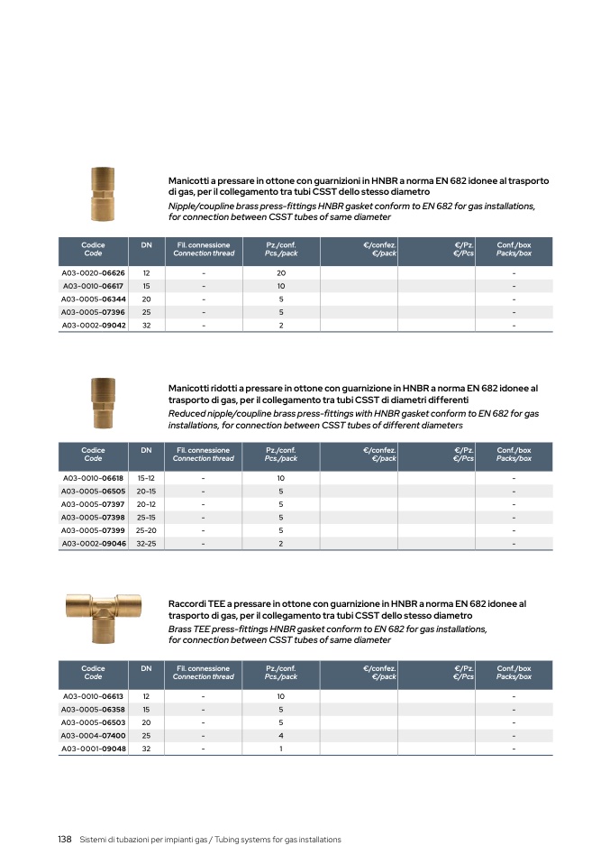 Manicotti a pressare in ottone con guarnizioni in HNBR a norma EN 682 idonee al trasport