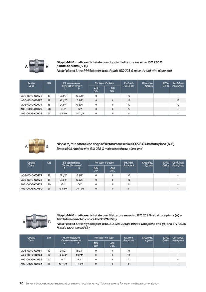 Nickel plated brass M/M nipples with ISO 228 G male thread with plane end (A) and EN 10226