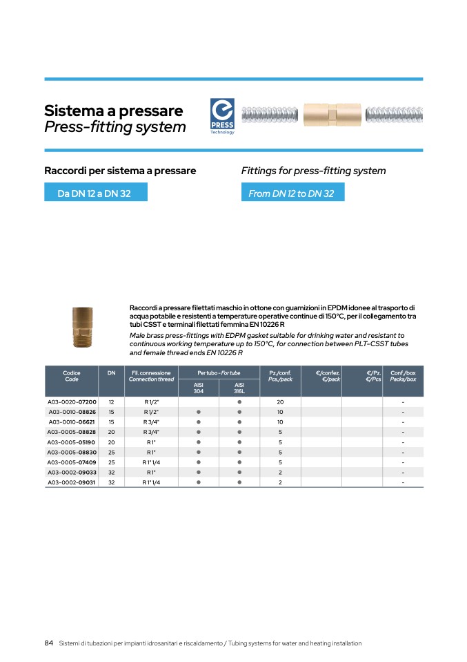 Male brass press-fittings with EDPM gasket suitable for drinking water and resistant to