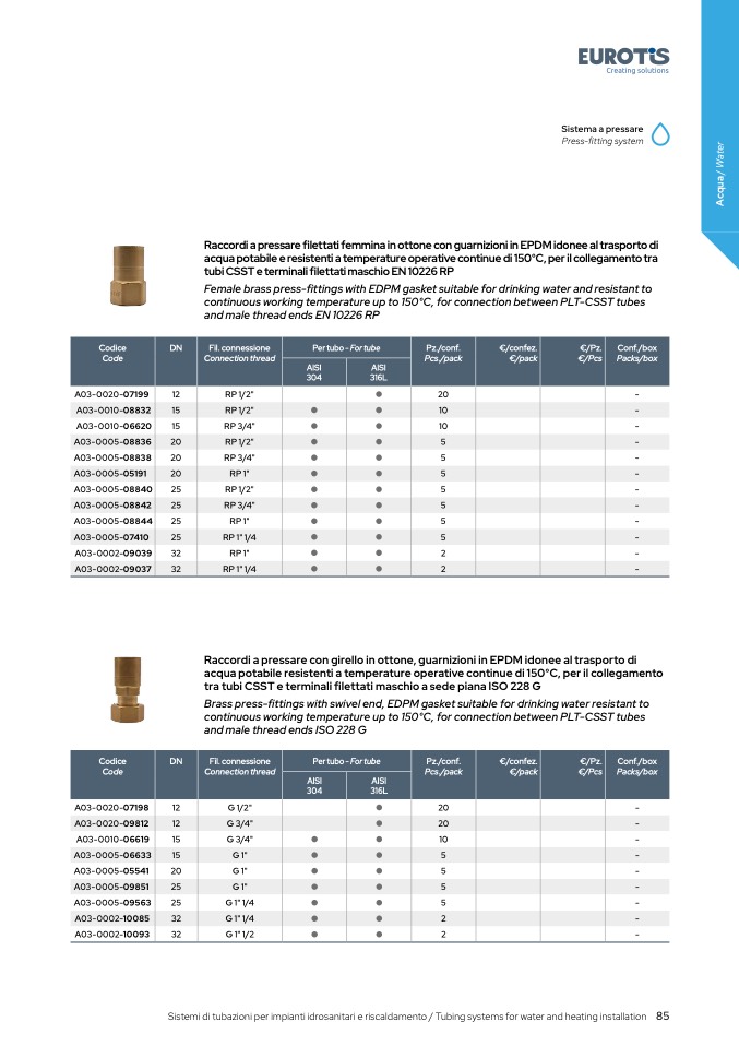 Female brass press-fittings with EDPM gasket suitable for drinking water and resistant t