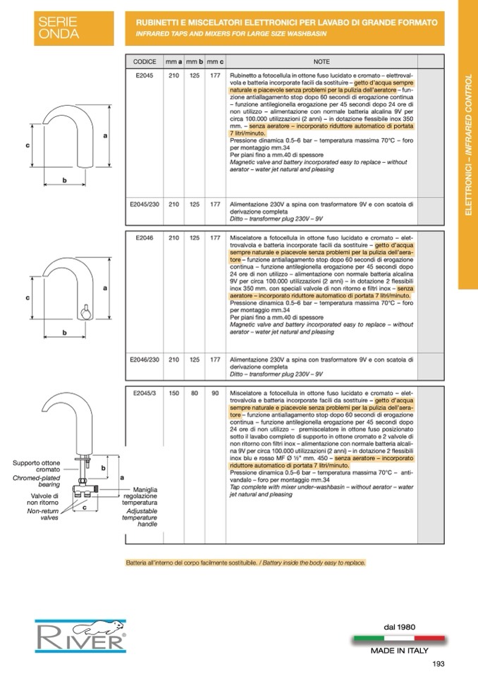 Pressione dinamica 0.5–6 bar – temperatura massima 70°C – foro