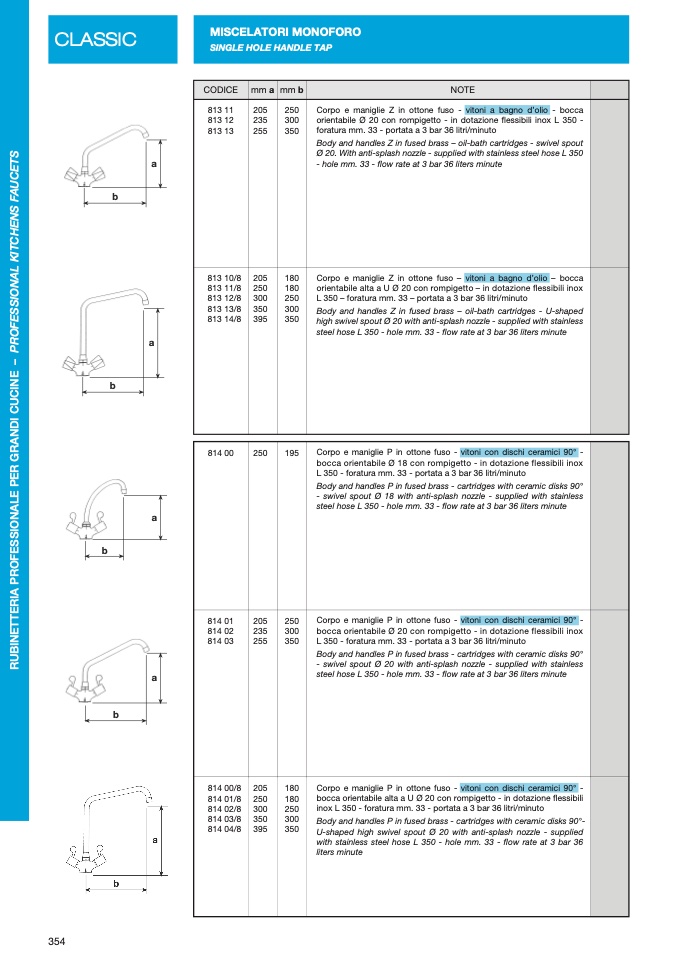 with stainless steel hose L 350 - hole mm. 33 - flow rate at 3 bar 36