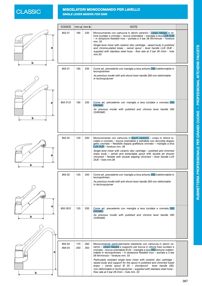 Monocomando con cartuccia in dischi ceramici – corpo in ottone lu-