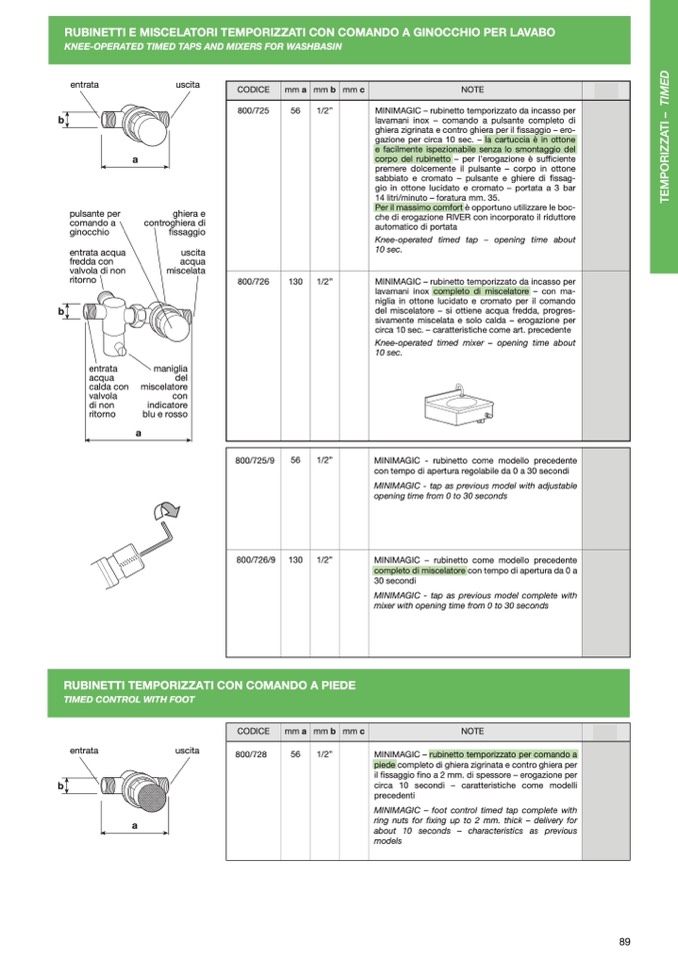 RUBINETTI E MISCELATORI TEMPORIZZATI CON COMANDO A GINOCCHIO PER LAVABO