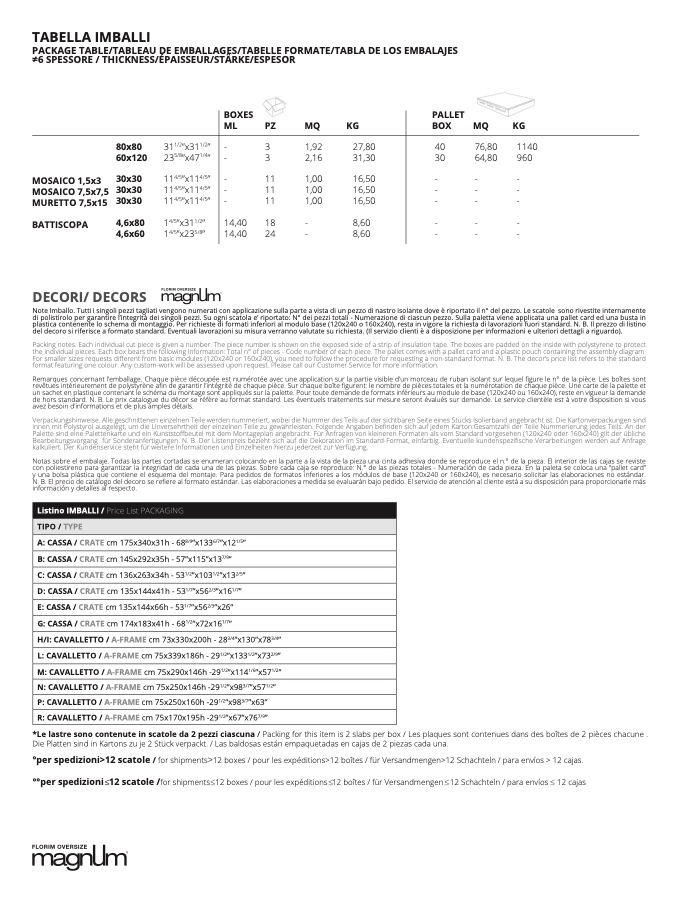 stirolo per garantire l’integrità dei singoli pezzi. Su ogni scatola e’ riportato: N° dei pezzi totali - Numerazione di ciascun pezzo. Sulla paletta viene applicata una pallet card ed una busta i