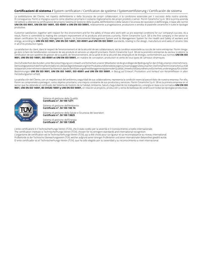 9001, UNI EN ISO 14001, ISO 45001 et UNI EN ISO 50001, en matière de conception, production et vente de tous types de carreaux céramiques