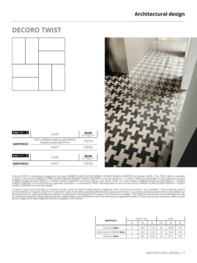 ck in the colours CARBON FLAKES GLOSSY-BRIGHT+PUMICE FLAKES COMFORT in the size 30x30 cm. / Le décor TWIST est disponible en stock dans les couleur