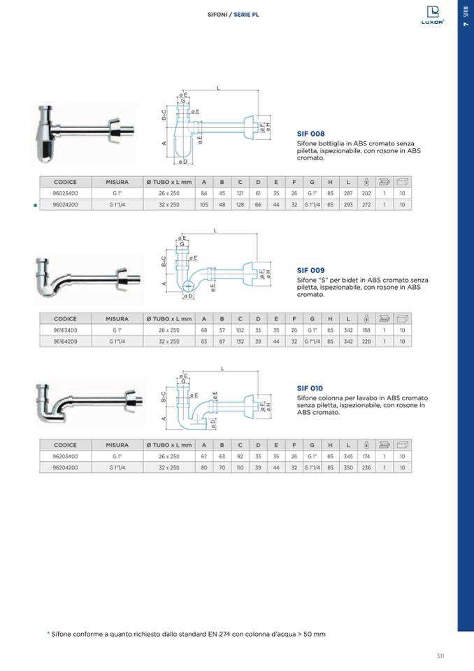 * Sifone conforme a quanto richiesto dallo standard EN 274 con colonna d’acqua > 50 mm