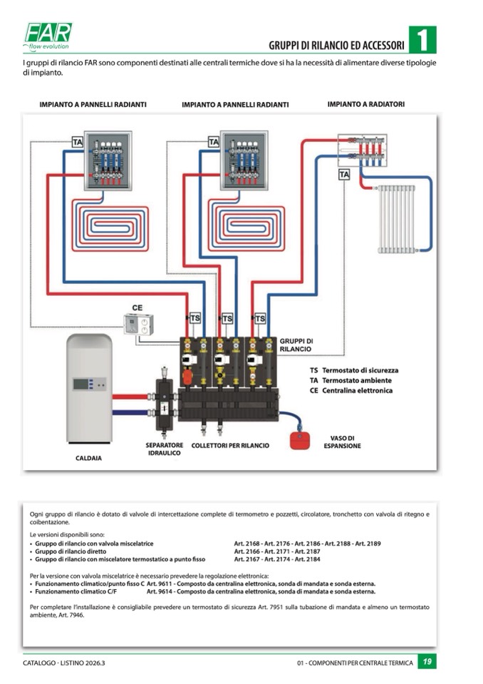 Ogni gruppo di rilancio è dotato di valvole di intercettazione complete di termometro e pozzetti, circolatore, tronchetto con valvola di ritegno e