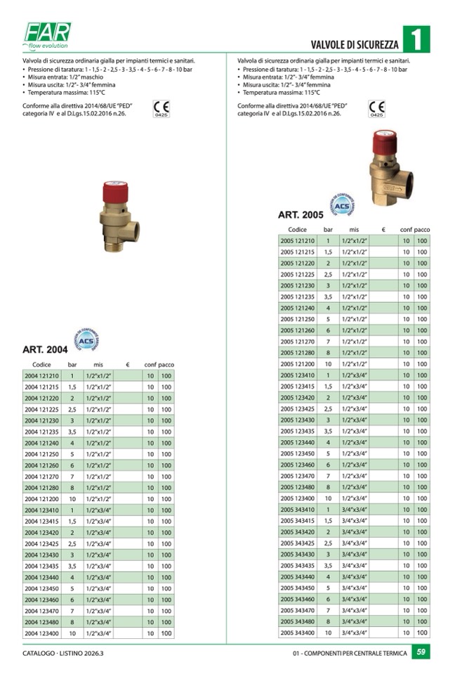 Pressione di taratura: 1 - 1,5 - 2 - 2,5 - 3 - 3,5 - 4 - 5 - 6 - 7 - 8 - 10 bar