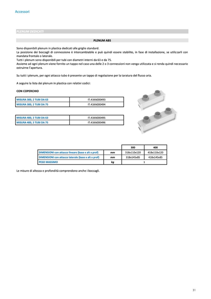 Tutti i plenum sono disponibili per tubi con diametri interni da 63 e da 75.