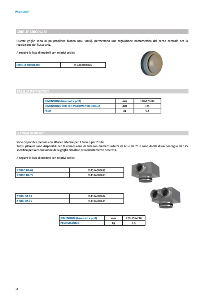 Tutti i plenum sono disponibili per la connessione di tubi con diametri interni da 63 e da 75 e sono dotati di un boccaglio da 125