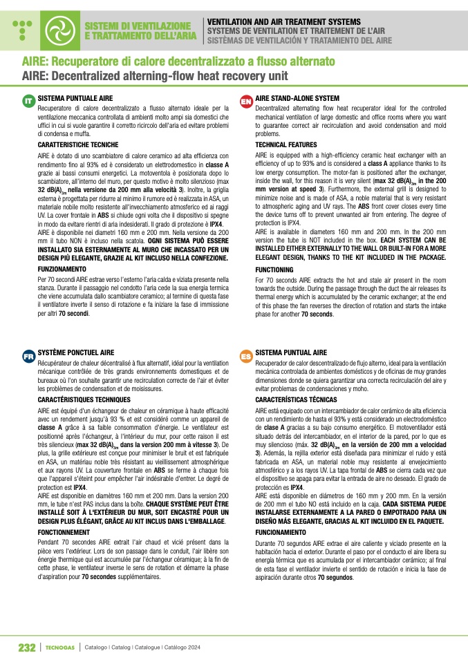 AIRE è dotato di uno scambiatore di calore ceramico ad alta efficienza con