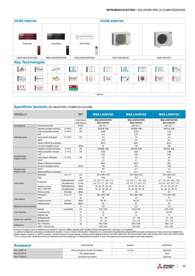 globale rispetto a quelli con un GWP più elevato. I prodotti contenuti in questo catalogo contengono fluidi refrigeranti del tipo: HFC-R32 (GWP 675), HFC-R410A (GWP 2088), HFC-R134a (GWP 1430) e HFC-R407C (GWP