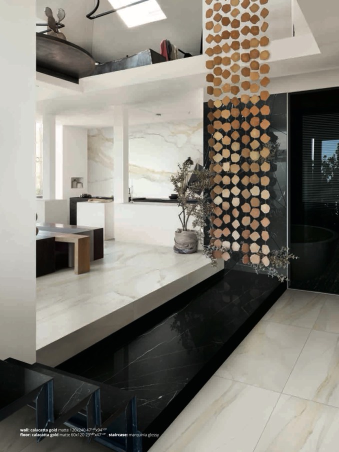 floor: calacatta gold matte 60x120 235/8”x471/4” . staircase: marquinia glossy