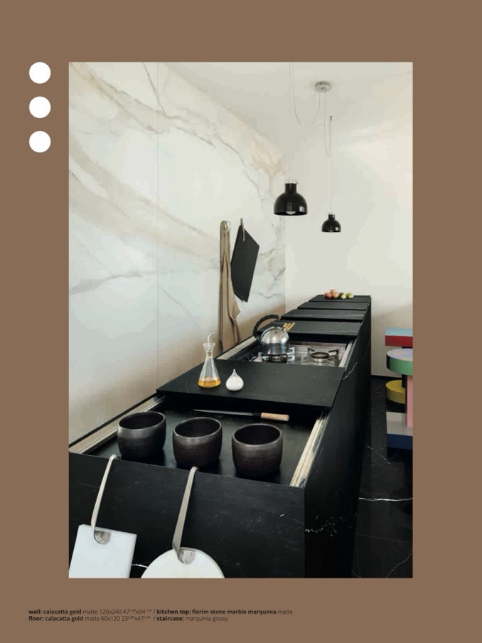 wall: calacatta gold matte 120x240 471/4”x941/2” / kitchen top: florim stone marble marquinia matt