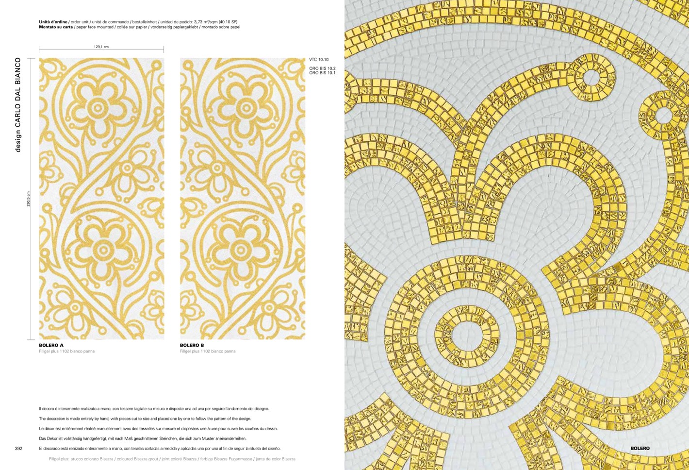 El decorado está realizado enteramente a mano, con teselas cortadas a medida y aplicadas una por una al fin de seguir la silueta del diseño.