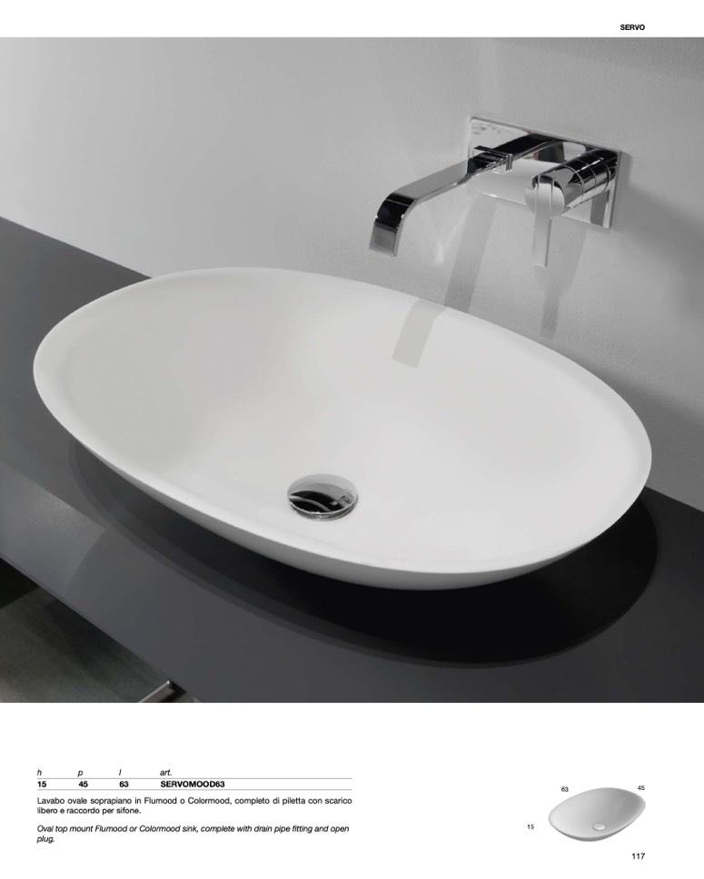 Lavabo ovale soprapiano in Flumood o Colormood, completo di piletta con scarico