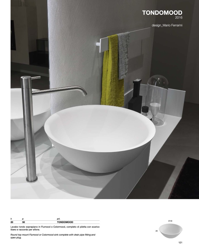 Lavabo tondo soprapiano in Flumood o Colormood, completo di piletta con scarico