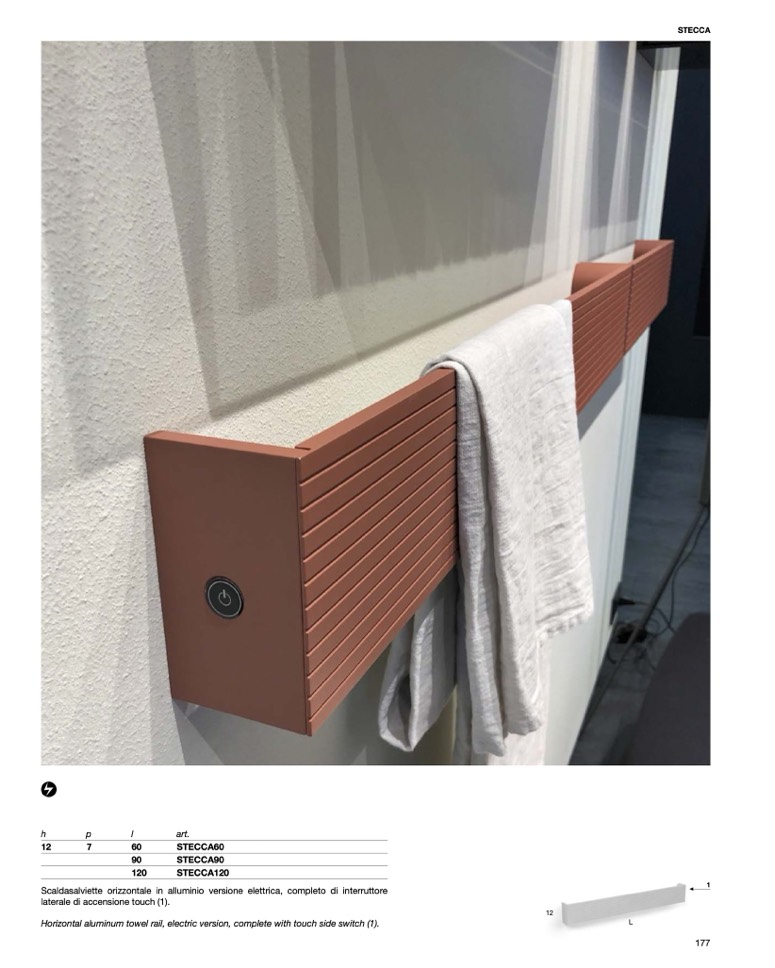 Horizontal aluminum towel rail, electric version, complete with touch side switch (1).
