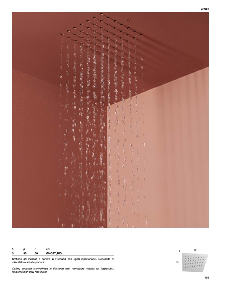 Soffione ad incasso a soffitto in Flumood con ugelli ispezionabili. Necessita di