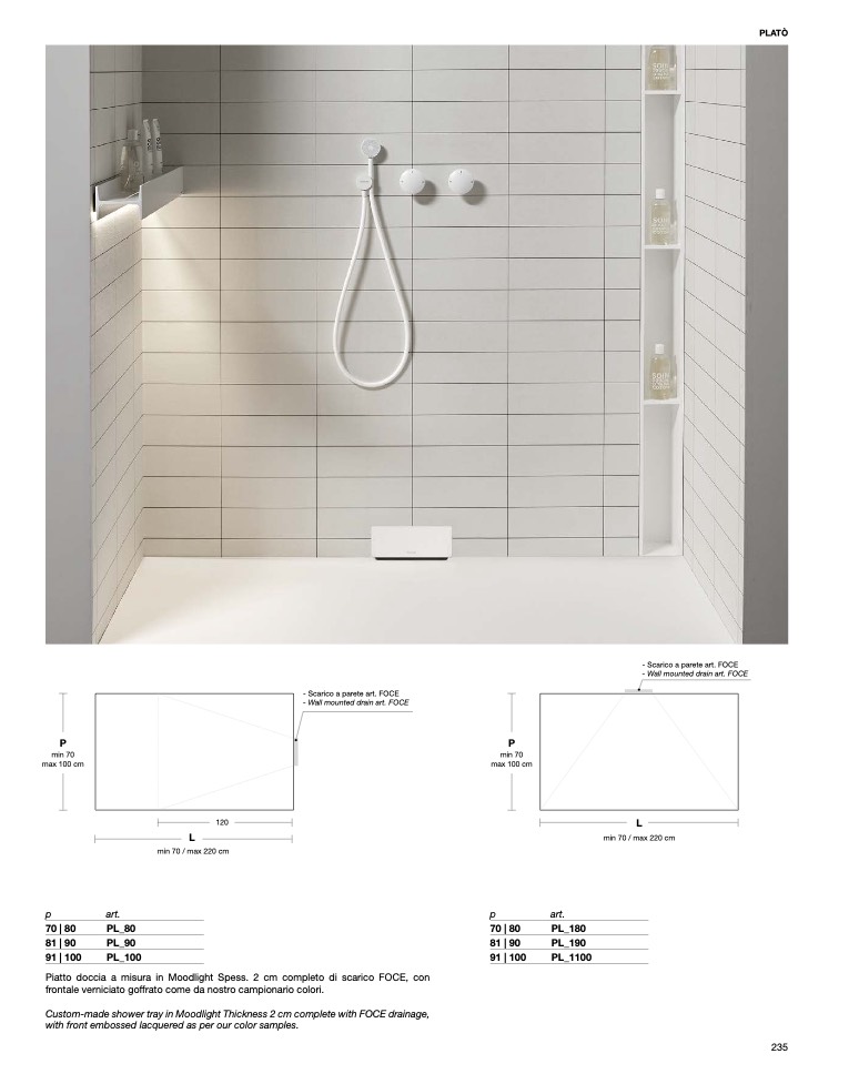 Custom-made shower tray in Moodlight Thickness 2 cm complete with FOCE drainage,