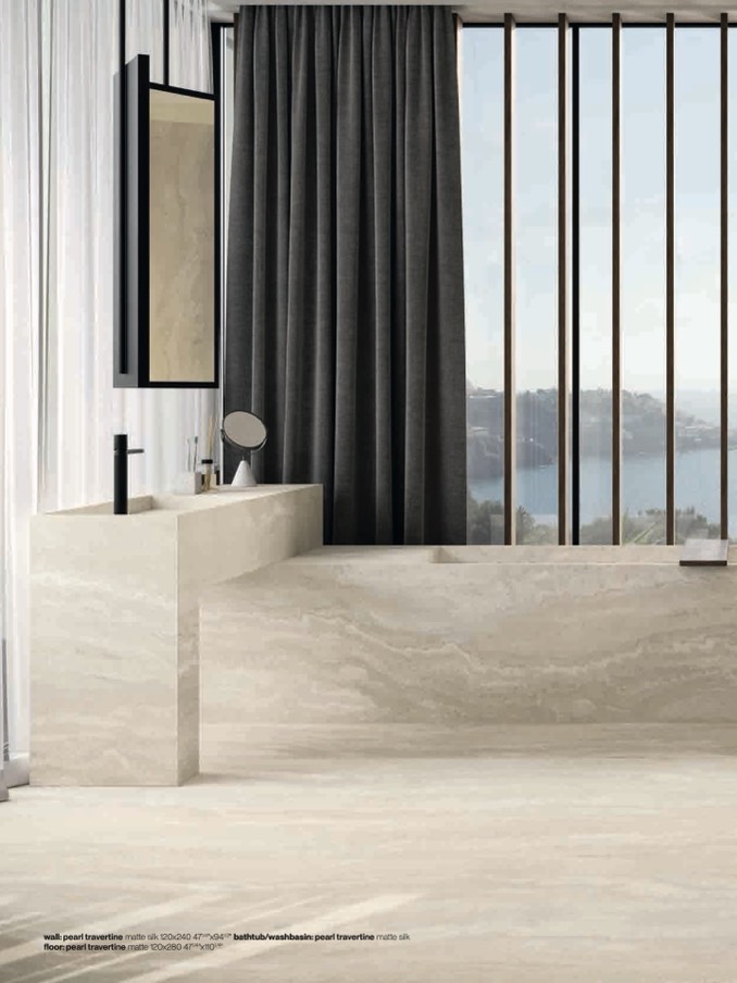wall: pearl travertine matte silk 120x240 471/4"x941/2" bathtub/washbasin: pearl travertine matte silk