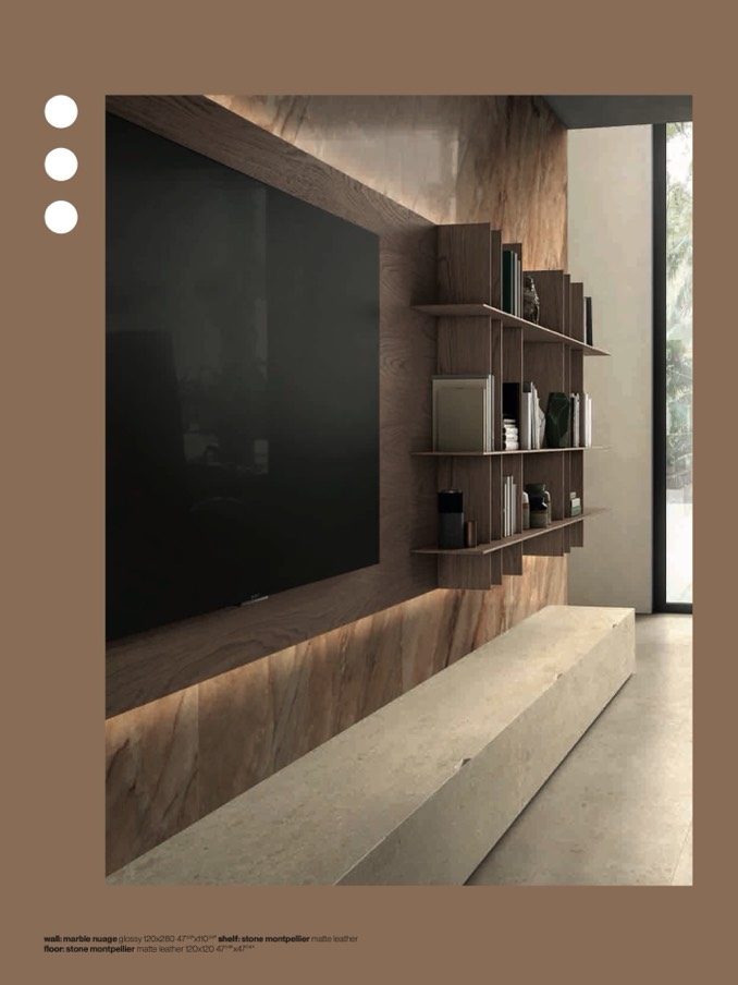 wall: marble nuage glossy 120x280 471/4"x1101/4" shelf: stone montpellier matte leathe
