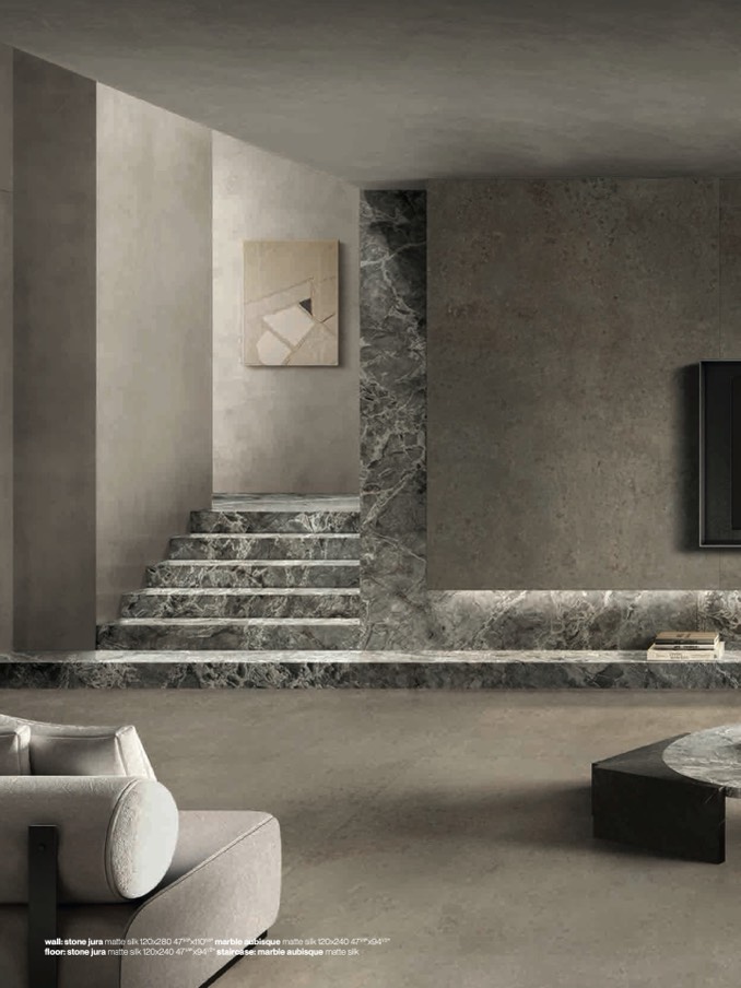 floor: stone jura matte silk 120x240 471/4"x941/2" staircase: marble aubisque matte silk