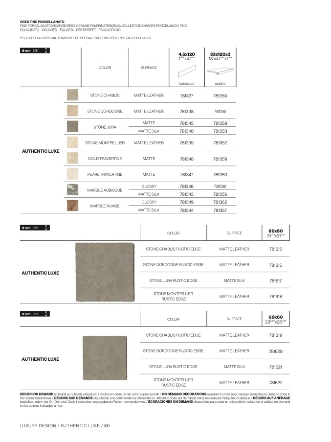 the colors listed above. / DÉCORS SUR DEMANDE disponibles à la commande sur demande en utilisant le code sur demande dans les couleurs indiquées ci-dessus. / DEKORE AUF ANFRAGE