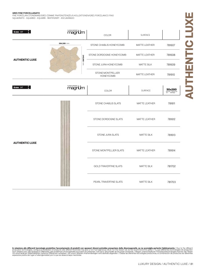 In relazione alle differenti tecnologie produttive l’accostamento di prodotti con spessori diversi potrebbe presentare delle disomogeneità, se ne sconsiglia pertanto l’abbinamento./ Due to the di