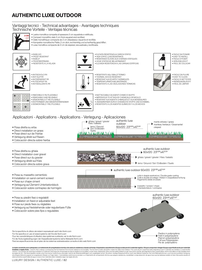 installato a regola d’arte. / Ceramic tiles undergo a compacting thermal treatment that ensures resistance and durability. The low level of water absorption makes the slabs frost resistant. This could result in superficial water stagnations even if materials are installed in a workmanlik