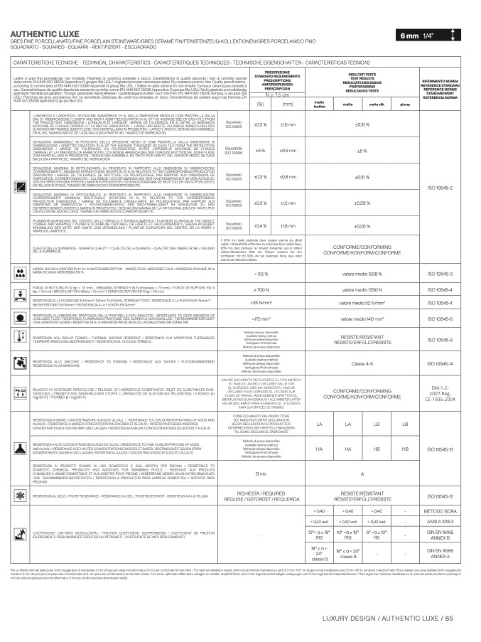 dalla norma EN 14411-ISO 13006 Appendice G gruppo BIa UGL/ Unglazed porcelain stoneware slabs. Dry-pressed ceramic tiles. Quality specifications,