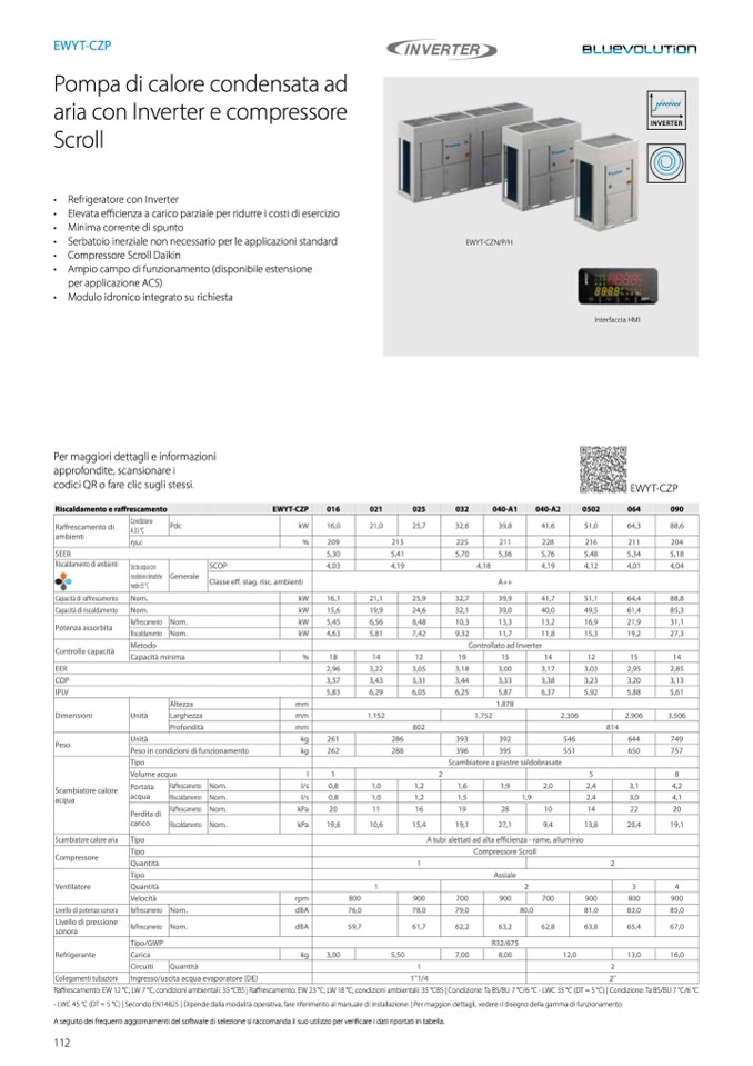 Raffrescamento: EW 12 °C; LW 7 °C; condizioni ambientali: 35 °CBS | Raffrescamento: EW 23 °C; LW 18 °C; condizioni ambientali: 35 °CBS | Condizione: Ta BS/BU 7 °C/6 °C - LWC 35 °C (DT = 5 °C) | Condizione: Ta BS/BU 7 °C/6 °C